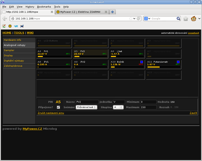 - Připojeno? - pokud je zaškrtnuto, pin je nastaven jako připojený. V opačném případě je nastaven jako odpojený. Ve www rozhraní je odpojený pin vizuálně odlišen od pinu připojeného.